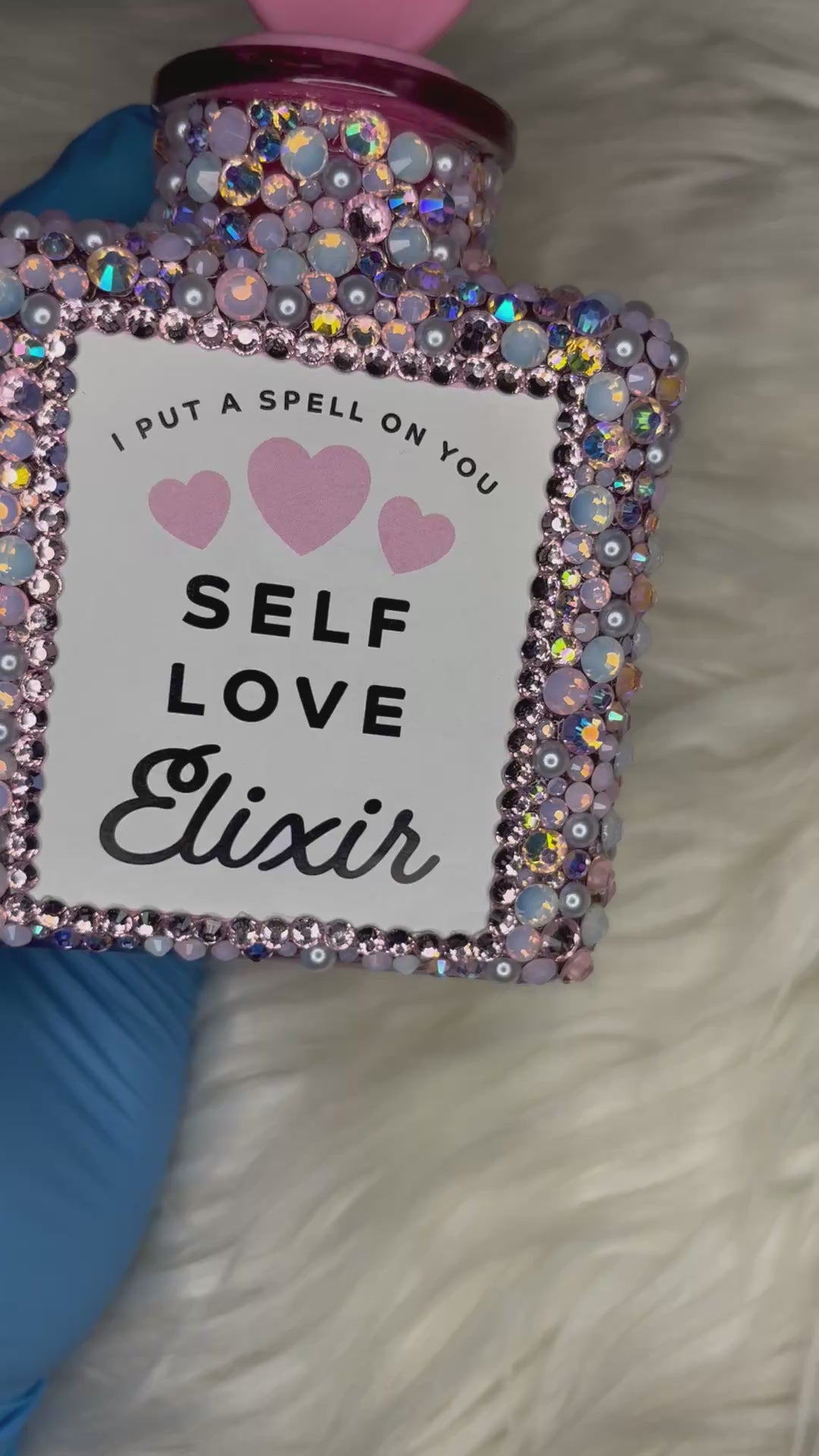 Baby Pink & White Pearls Bling “Self Love Elixir” Bottle (Empty)